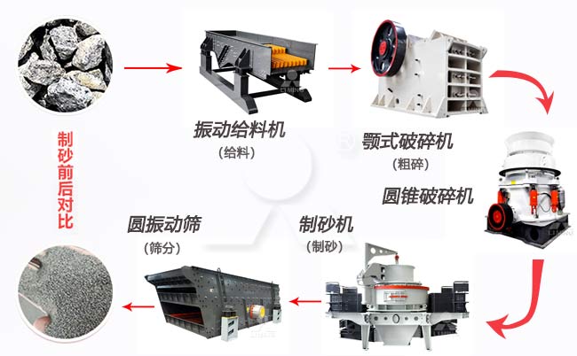 要生產高質量砂石骨料,就離不開嚴格的生產流程。一般適合公路、鐵路用的砂石料為鵝卵石、花崗巖、石灰巖等。這些大塊巖石經過給料機進入破碎設備進行初級破碎和二級破碎,經過傳輸帶進入制砂機進行細碎整形。最后經過洗砂環節,機制砂成品就生產好了。