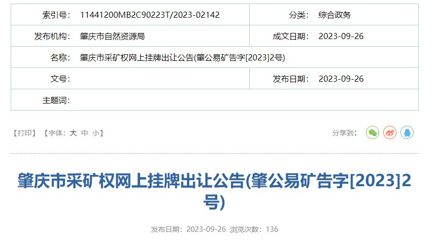 9月26日,廣東肇慶自然資源局發布封開縣長崗鎮欖逕礦區飾面用花崗巖礦采礦權掛牌出讓公告。該礦飾面用花崗巖礦資源儲量16629萬方(超1.66億方)、建筑用花崗巖礦資源儲量2349萬方,合計18978萬(約1.9億方)。設計年產700萬方,出讓30年,其實價格47.5億元。